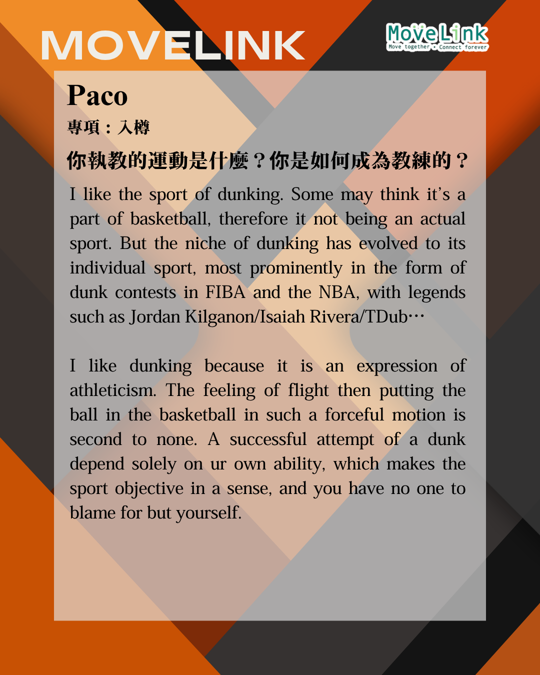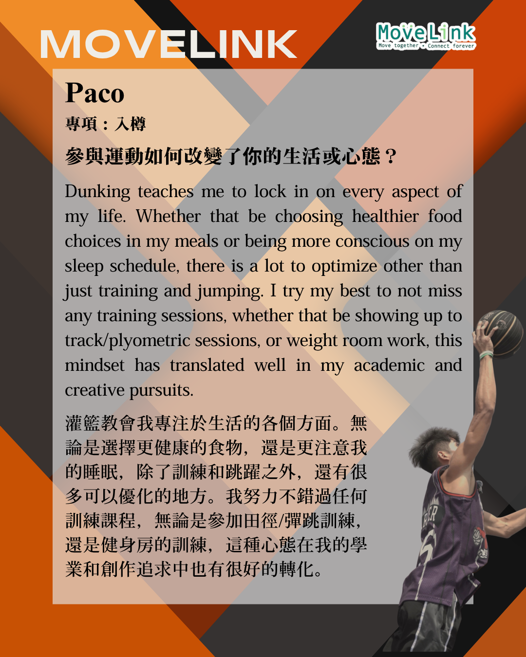 Home / 「他們」的精彩運動文章 Their sport journey / 震撼扣籃之旅:Paco的空中霸業 震撼扣籃之旅:Paco的空中霸業 Oct 20, 2025 MoveLink Facebook Twitter Pin Line Whatsapp Tumblr Back to the blog title Post comment Name E-mail Post comment Post comment